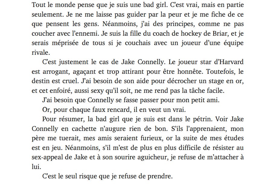 Une jeune personne avec un mullet rose se presse entre les portes de la ligne 3. Sur son strapontin, elle reprend son roman là où elle l’a laissé. Je distingue une couverture typique du genre Young Adult. Une jeune femme au cheveux longs et bruns arbore un t-shirt légèrement décolleté sous lequel on devine une poitrine pressé par un de ses soutien-gorge à baleines que nous sommes nombreuses à avoir délaissés depuis belle lurette. C’est sur ce t-shirt que figure le titre du roman : Briar Université 2. La jeune femme a la bouche entrouverte et maquillée de rouge. On ne voit ni son nez ni ses yeux, mais sa veste de cuir me laisse penser qu’elle a quelque chose de rebelle, de quelqu’un qui ne se plie pas aux règles.